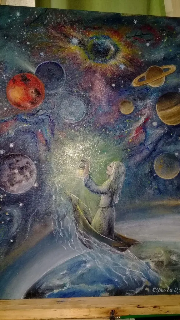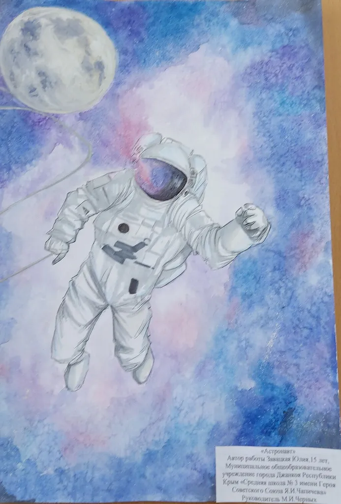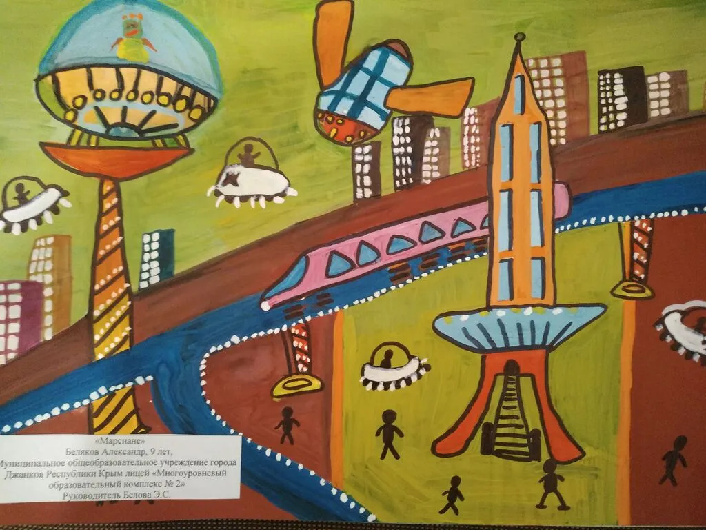 На рисунках и картинах мы видим фантастические летающие объекты других галактик, портреты космонавтов, космические корабли будущего, полет первого космонавта, иные звёздные миры.