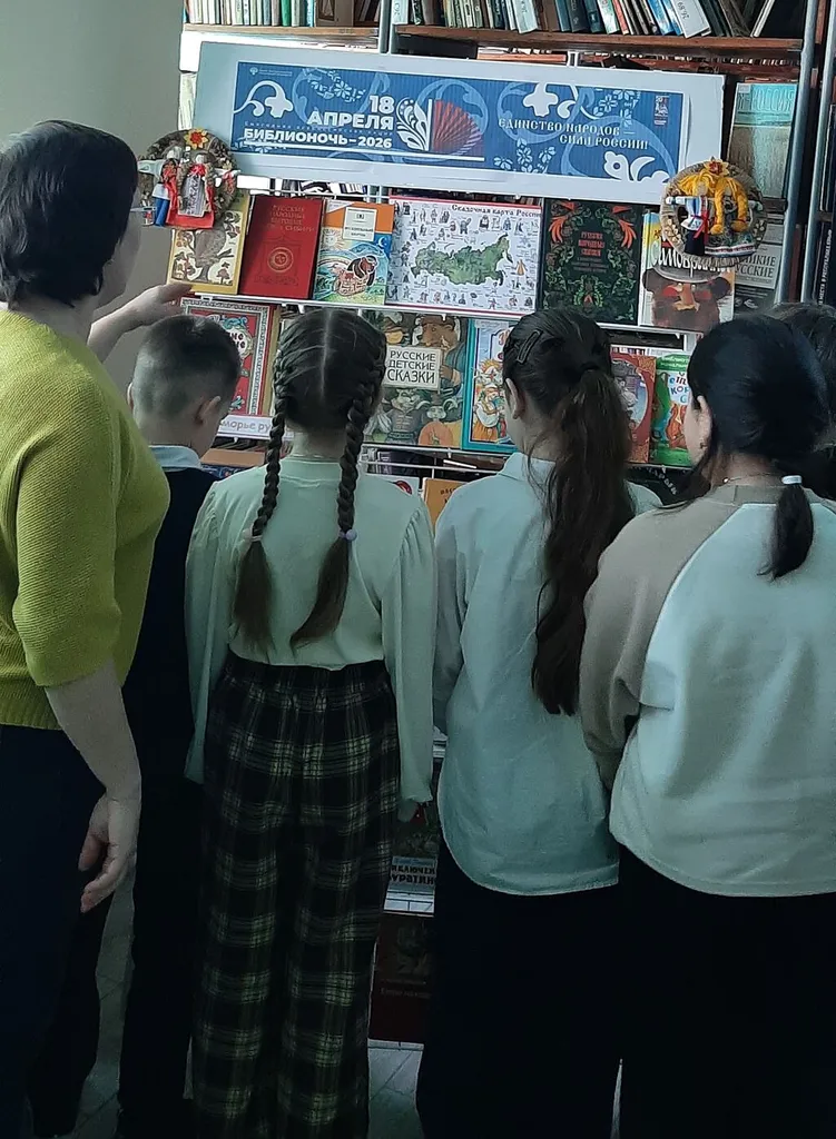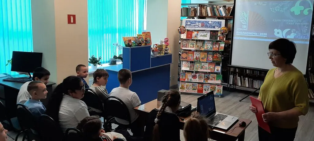 Всероссийская акция «Библионочь — 2026» прошла 18 апреля 2026 года в 15-й раз. Тема года - «Единство народов — сила России!». Городская детская библиотека также приняла участие в этом замечательном мероприятии. В читальном зале для учащихся начальной школы прошла игра-путешествие «Сказки, в которых живёт Россия». Проводником в путешествии стала библиотекарь. Дети отправились в познавательное путешествие по сказочному миру народов России. Они прочитали вслух сказку народов Крайнего Севера «Девушка и луна», посмотрели мультфильм «Золотое перо» по мотивам татарской сказки и послушали бурятскую сказку «Богатырь Байкал». Дети узнали, что единственной рекой, вытекающей из Байкала, является Ангара, и почему Байкал всегда выглядит сердитым. Мероприятие помогло детям увидеть, что сказка — не вымысел, а часть нашей жизни, которая живёт в городах, традициях и сердцах людей. Через игру ребята начинают лучше понимать и любить свою страну, через образы сказочных героев участники узнают о городах и регионах, их достопримечательностях и традициях и знакомство с фольклором нашей страны становится для них ярким и запоминающимся приключением. А путешествовать ребятам помогали книжная выставка «Дружат народы сказками» и сказочная карта России.