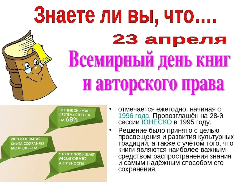 Гораздо позже, уже в 1995 году, на заседании ЮНЕСКО было принято решение о создании памятной даты — Всемирного дня книги и авторского права. Праздник сразу получил статус всемирного: с каждым годом количество стран, отмечающих его, только увеличивается. В этот день по всему миру проходят различные мероприятия: книжные ярмарки, литературные чтения, встречи с писателями, выставки и мастер-классы.